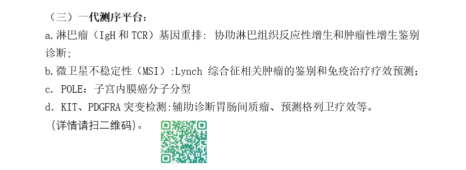 高通量测序平台:高通量测序技术又称“下一代”测序技术(NGS),以能一次并行对几十万到几百万条DNA分子进行序列测定和一般读长较短等为标志。单次检测可提供全面的靶向、免疫用药指导,为患者节省组织,并更好的辅助病理诊断,指导临床用药,综合判断患者的预后,并可提供新的可用药基因变异,提供可能的耐药机制。